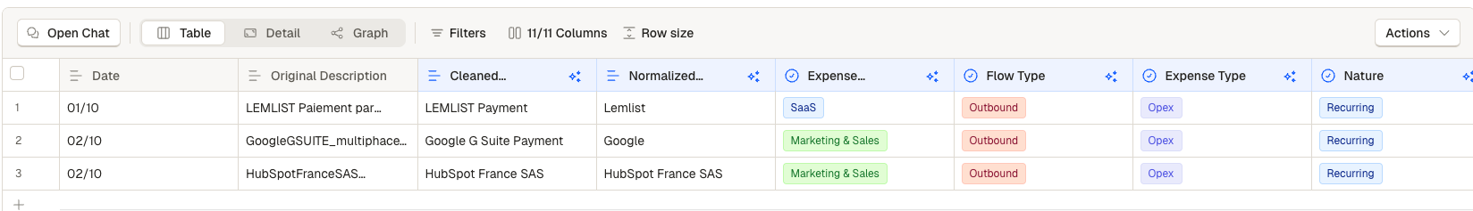 Reclaim several hours of manual categorization each month. Every transaction is automatically classified in seconds across five dimensions: expense category, flow direction, Opex/Capex, recurrence, and cost center.