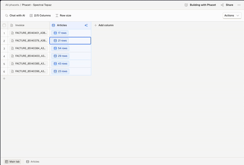 Collection Table | The new tab generated by the Collection column. It contains one row per extracted item and supports all standard table operations in Phacet. |
