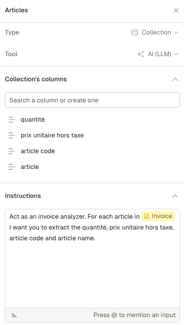 The Collection column type lets you extract multiple structured items from a single document—such as all line items on an invoice or all board members in a contract—and store them in a dedicated, reusable table.