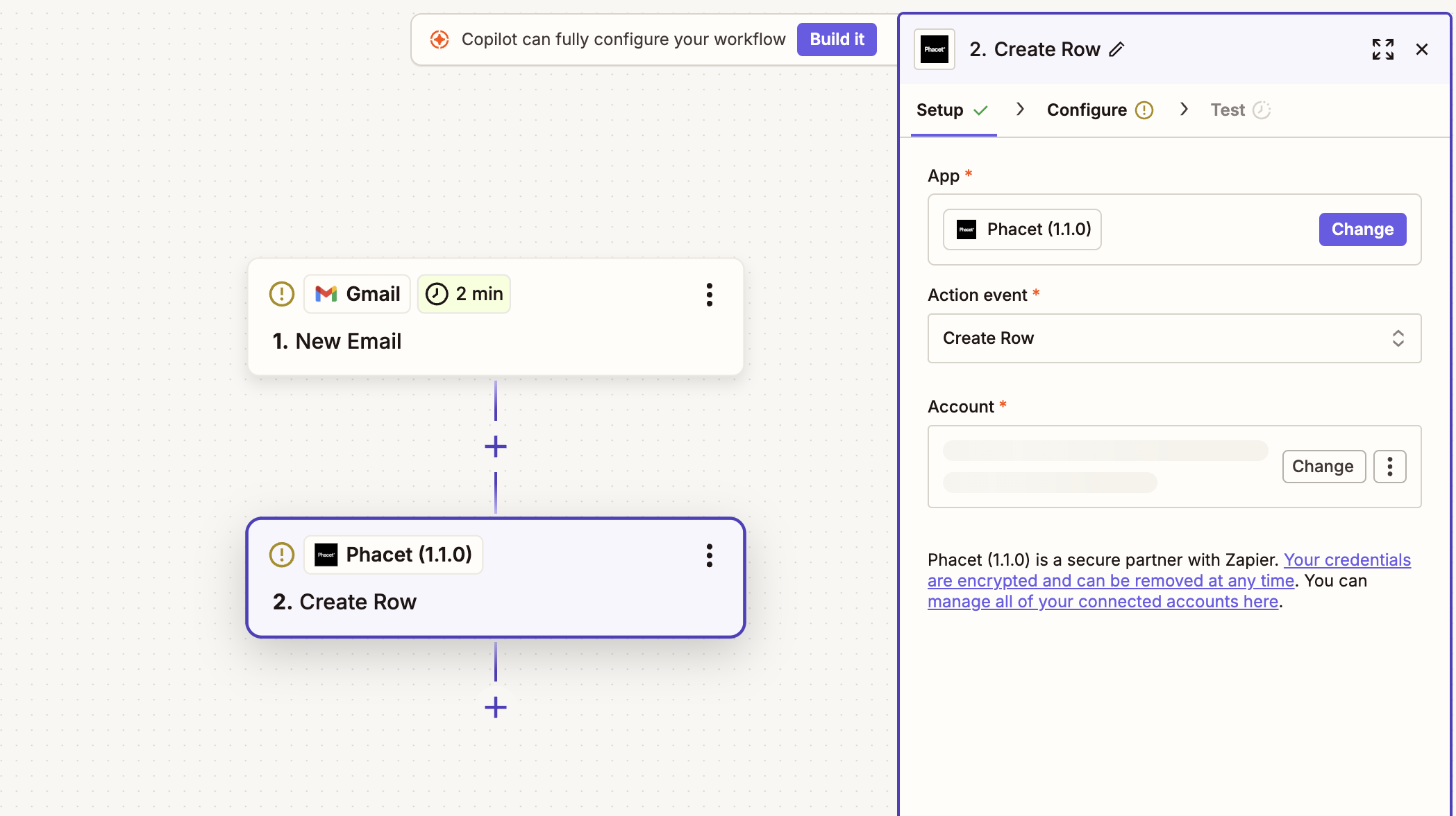 - Choose the Phacet action (e.g., “Create Row”, “Run AI Tool”).