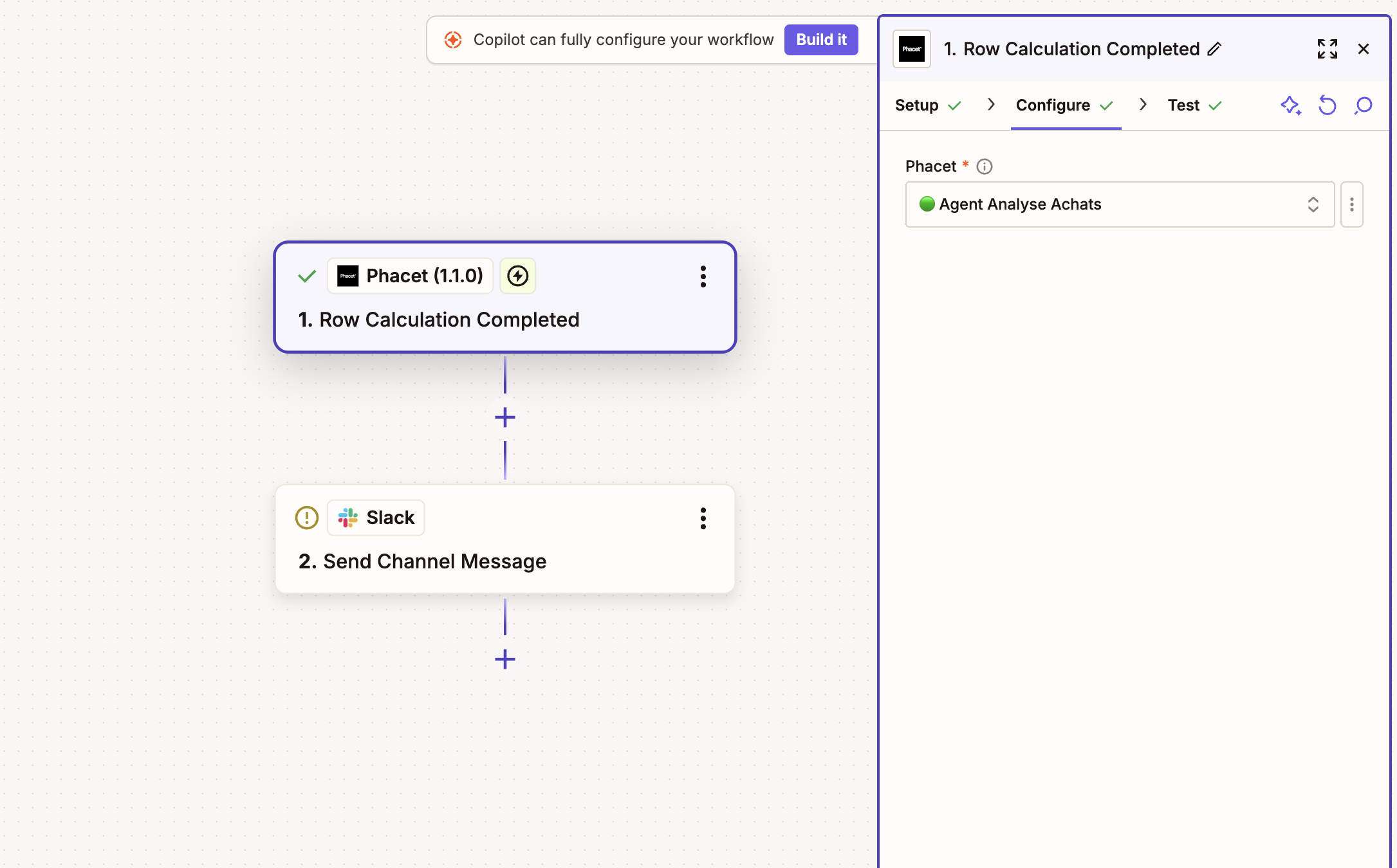 In this example, a message is sent to Slack every time Phacet complete ana analysis on a row.